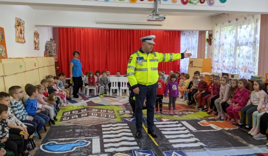 Într-o modalitate interactivă, cei mici s-au familiarizat cu indicatoarele rutiere și regulile de circulație, fiindu-le explicată semnificația și importanța fiecăruia, precum și modul de funcționare al semaforului pentru pietoni și pentru mașini.